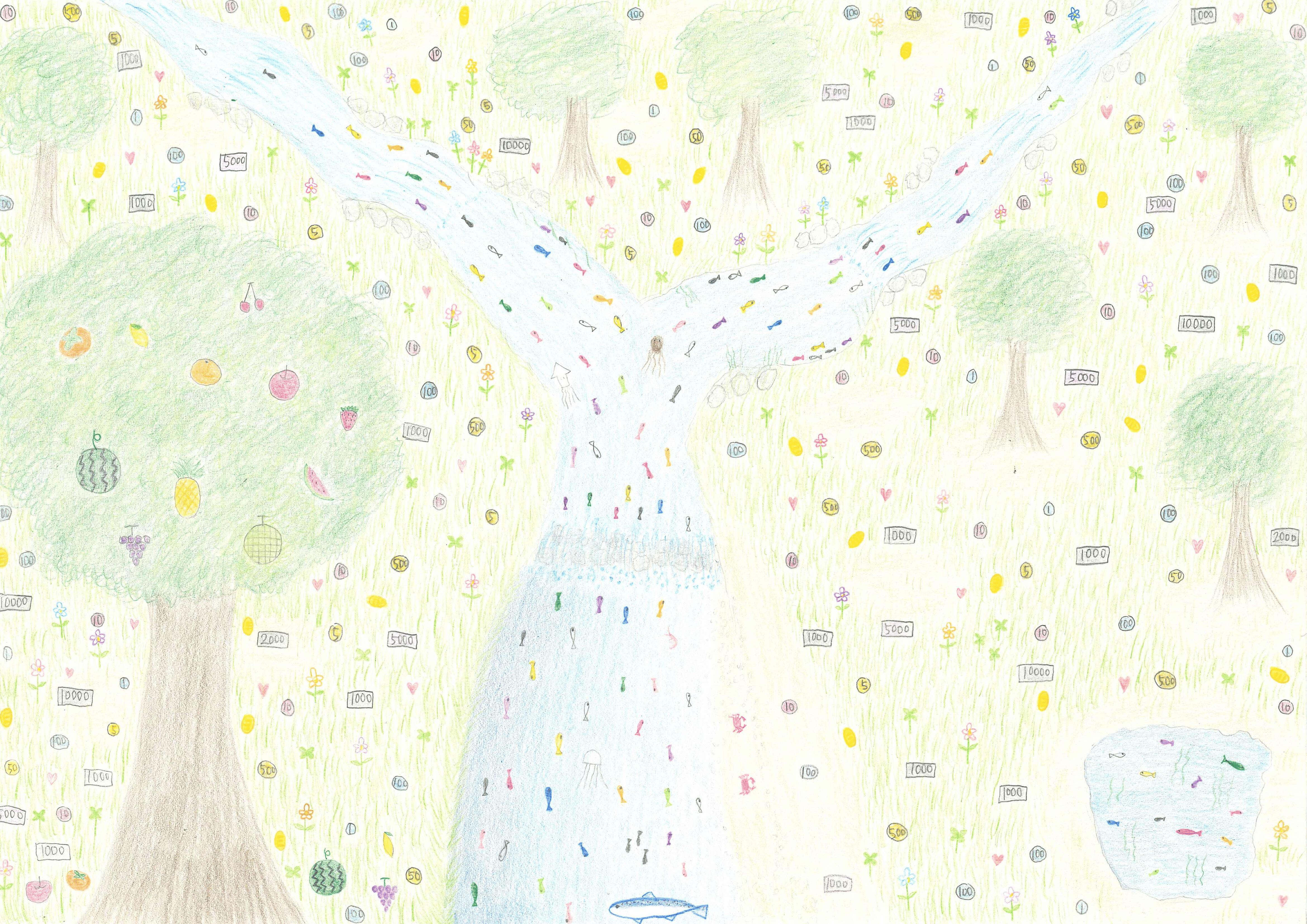 水の音から、小さな川と、黄緑色のキレイな森が想像されたので、小魚が小さい川を泳いでいる爽やかな黄緑色の森を描きました。