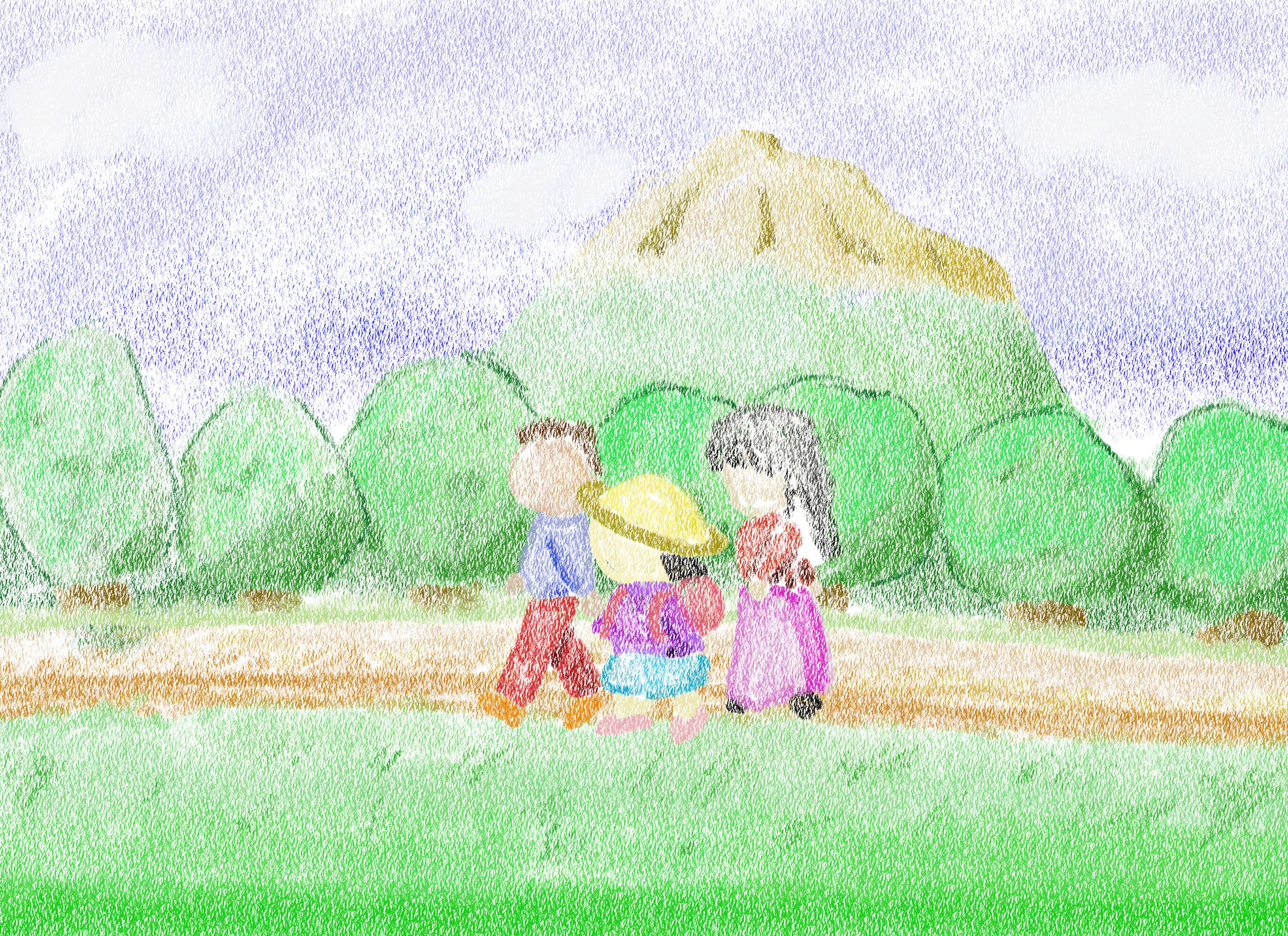 イントロを聴いた時に“楽しそう”なイメージを受け.音源中間くらいには、家族がおさんぽしてるイメージがういてきました。全体を聴いた所で”あたたかさ”があったので頭の中で早々に絵は完成していました。