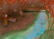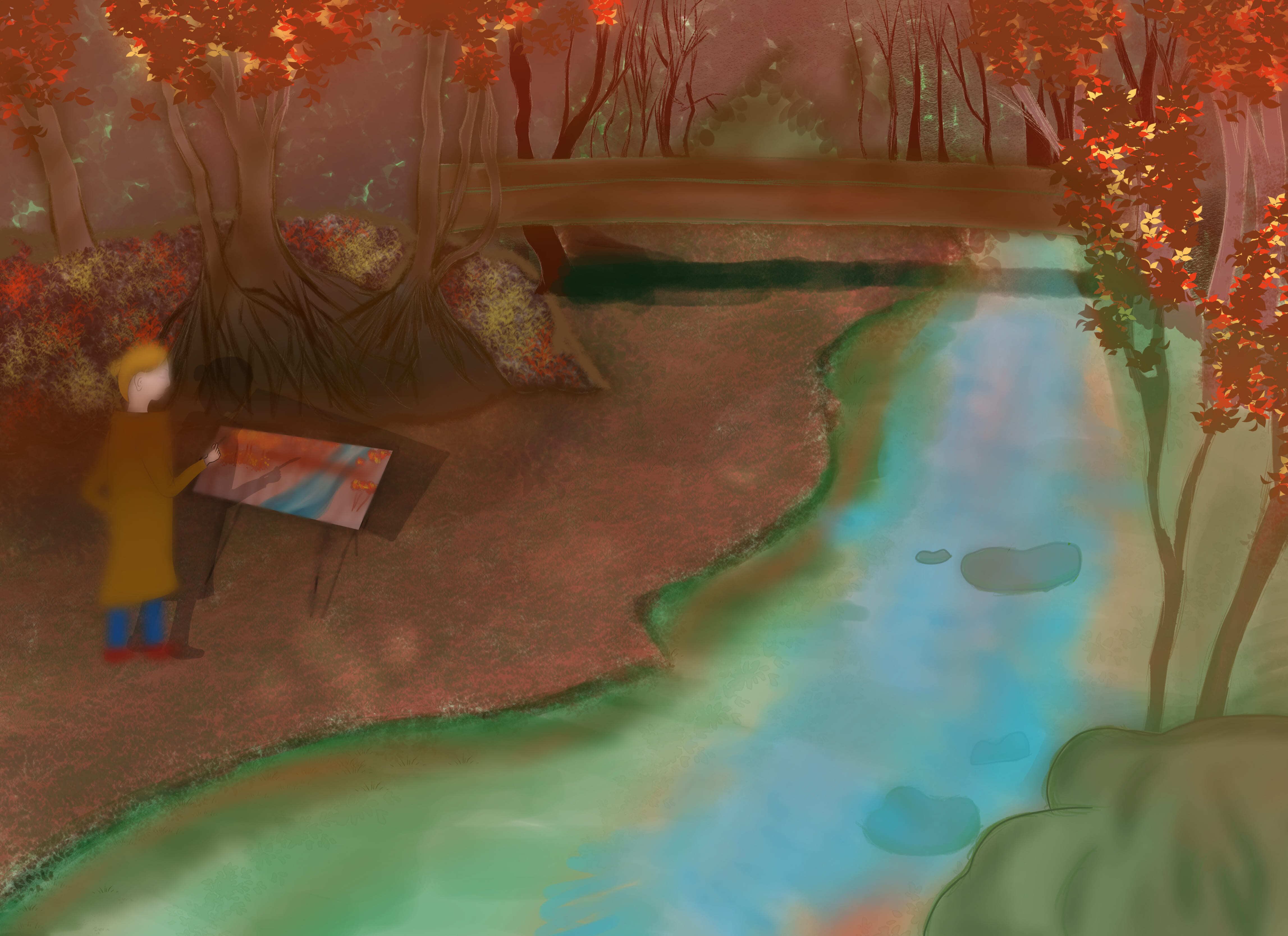 水が流れる自然のイメージが浮かんできたので紅葉のある自然の中に流れる川を描きました。