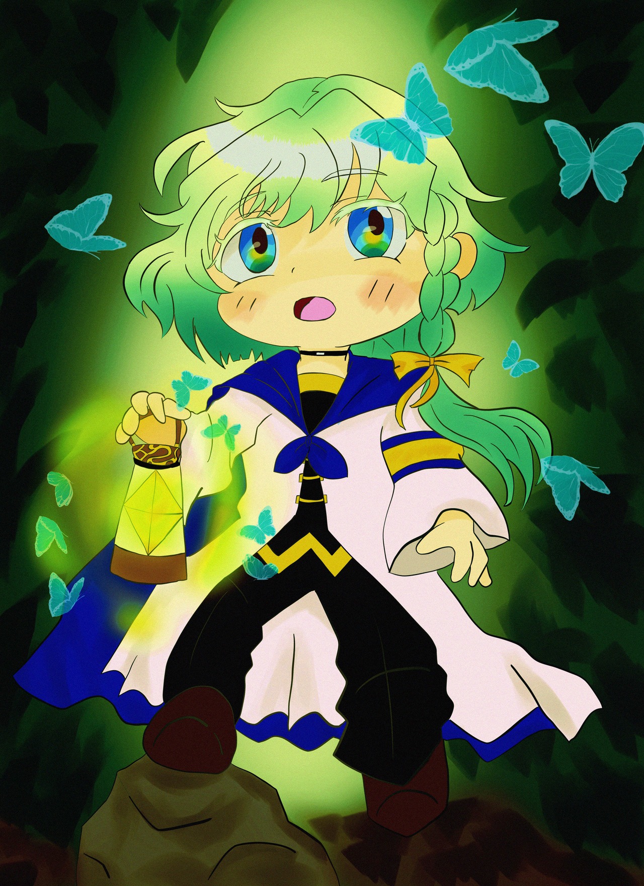 薄暗い森に主人公が心を奪われている感じに制作しました。