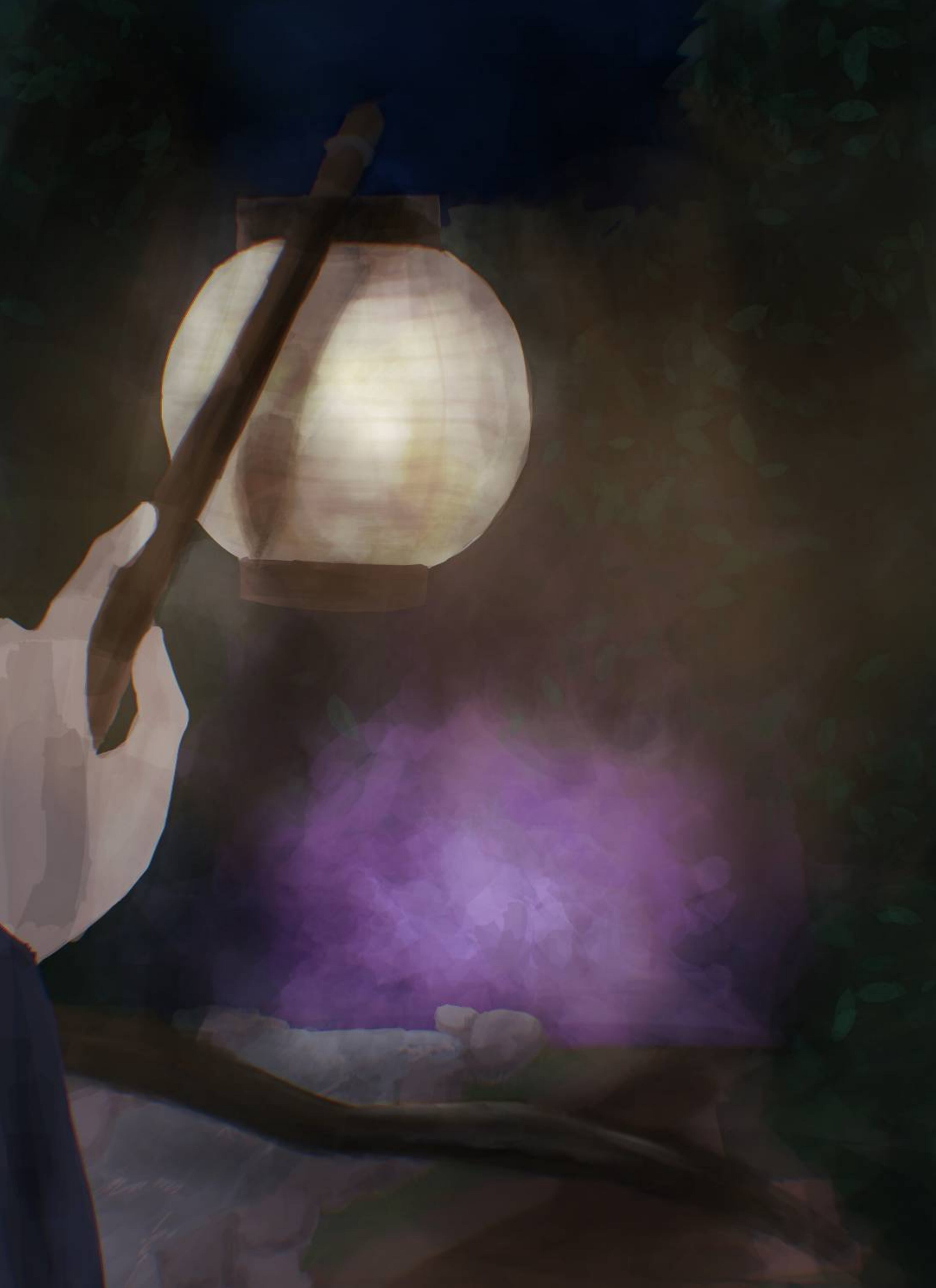 最初の方に水が流れるような音も聞こえたので川を描写したり、すこし不思議な、異世界のような世界観を感じたので紫に光っている森の描写などを取り入れました。